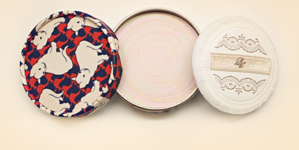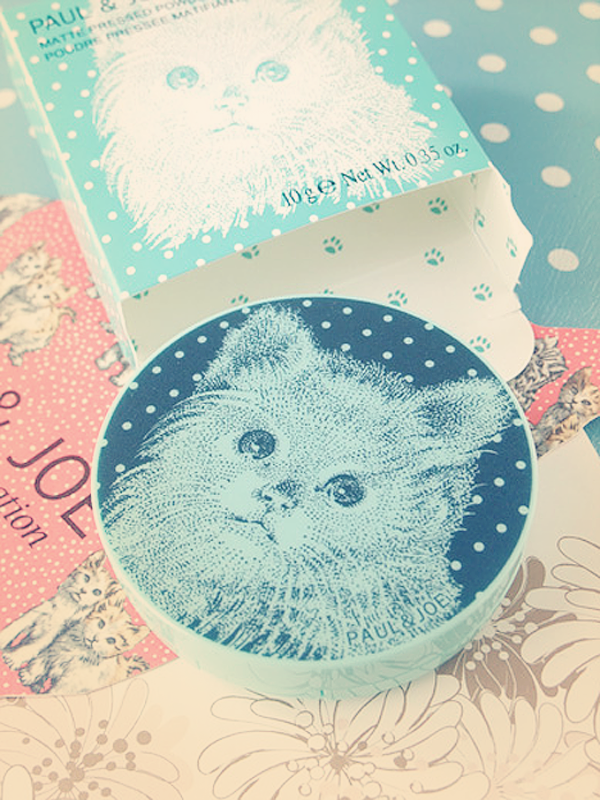 Puder prasowany, matujący cerę. W tym przypadku, przesłodkie jest błękitne puzderko w białe groszki, wykonane w stylu vintage + rysunek przesłodkiej „twarzyczki” kociaka. A co znajdziemy w środku? :) Gąbeczkę z pokaźnym śladem kociej łapy i cynamonową sylwetkę kota. W każdym razie, już samo pudełko byłoby z pewnością śliczną ozdobą każdej toaletki :)