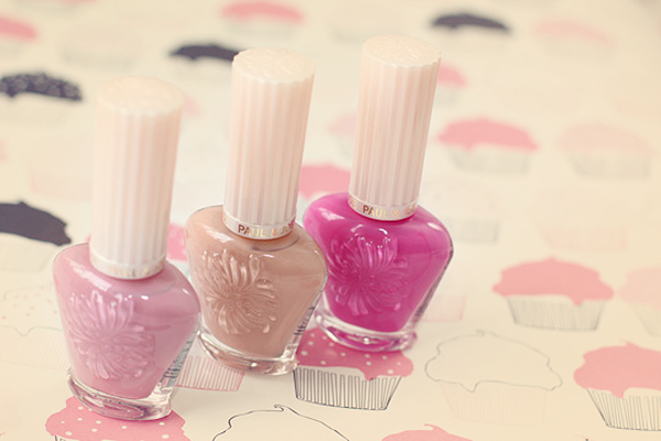 Lakiery do paznokci. Zapakowane są w różowe pudełeczka, całe w malutkich kociakach – rozrabiakach :) Są tu typowo wiosenne, wesołe kolorki: perłowy nude, guma balonowa i soczysty róż. A dodatkowo śliczny, perłowy primer.