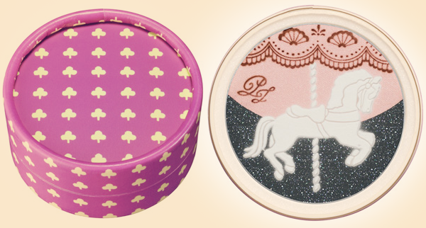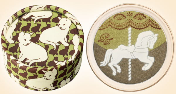 Obecnie, zapowiadana jest już kolejna kosmetyczna kolekcja – na wiosnę 2013 (jej większą część zamieszczam poniżej :)). Tutaj również pojawią się gdzieniegdzie słodkie kotki, ale nie będą już motywem przewodnim. Projektantka mocno zainspirowała się wesołym miasteczkiem, a przede wszystkim karuzelą z kucykami pony. Dlatego tym razem, po otworzeniu szminki, zobaczymy powierzchniowo wyrzeźbione sylwetki kucyków z karuzeli (kolory: cielisty, koralowy i fuksja). Ten sam wzór, tylko w postaci białego, matowego cienia, znajdziemy również w kosmetykach do makijażu powiek. Zachęcająco wygląda też puder transparentny, w którym zakręcone są jaśniutkie pastelowe kolory wraz z rozświetlającymi drobinkami :)